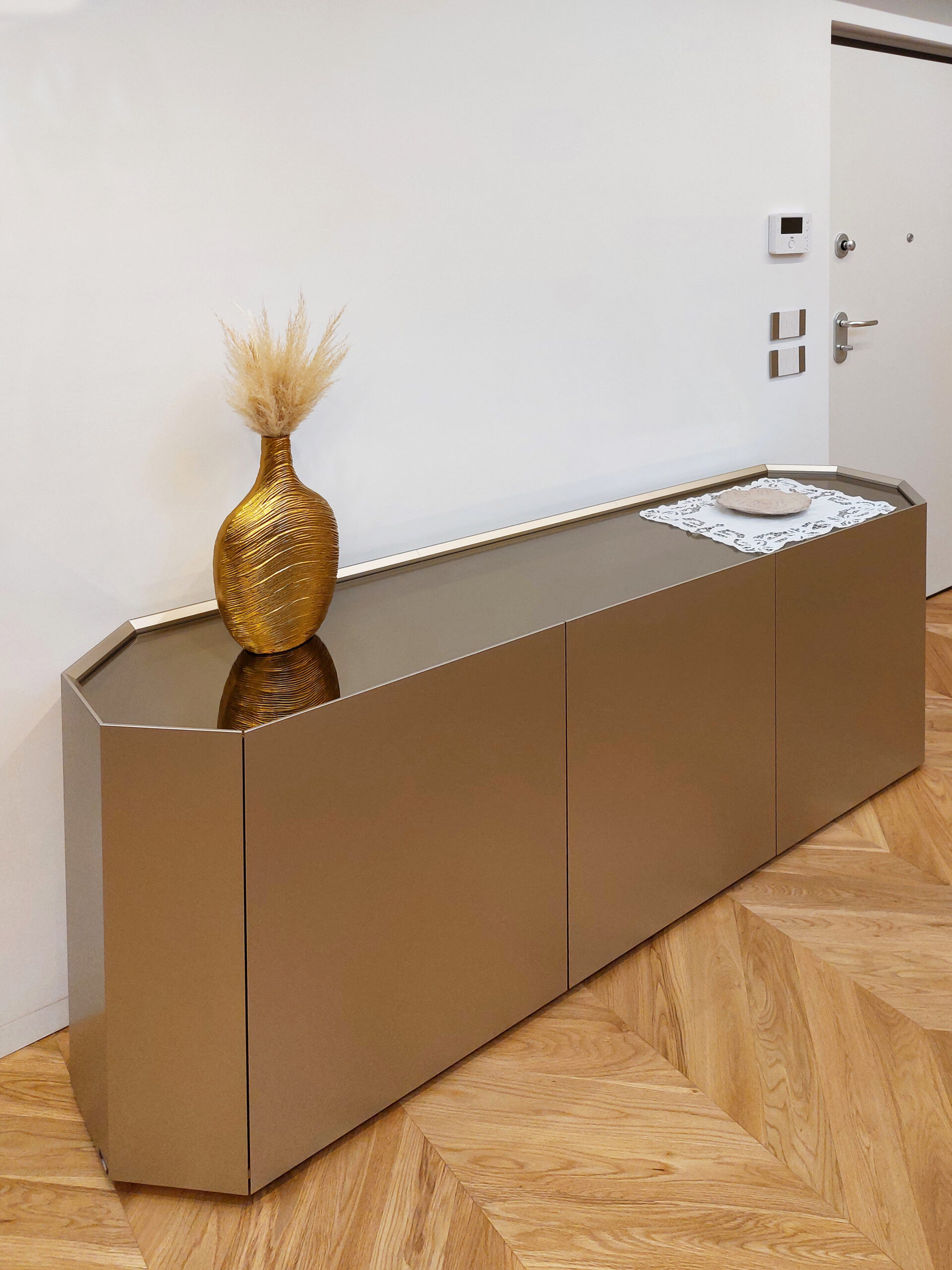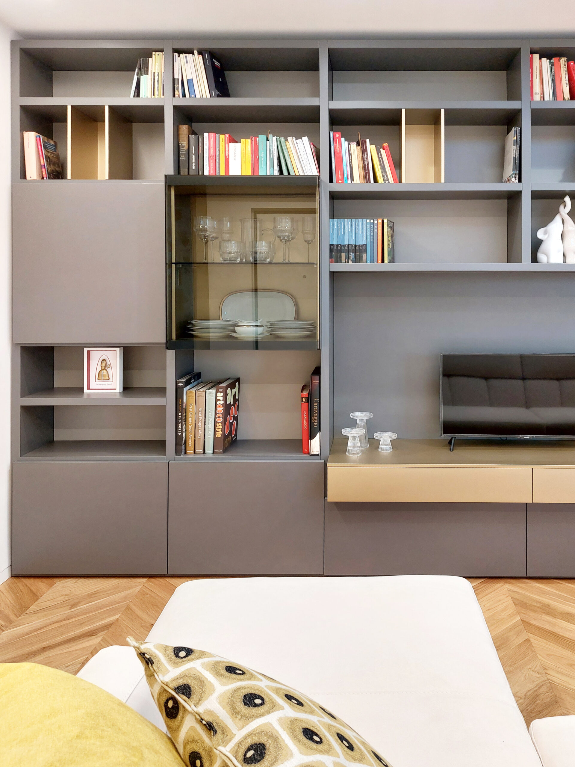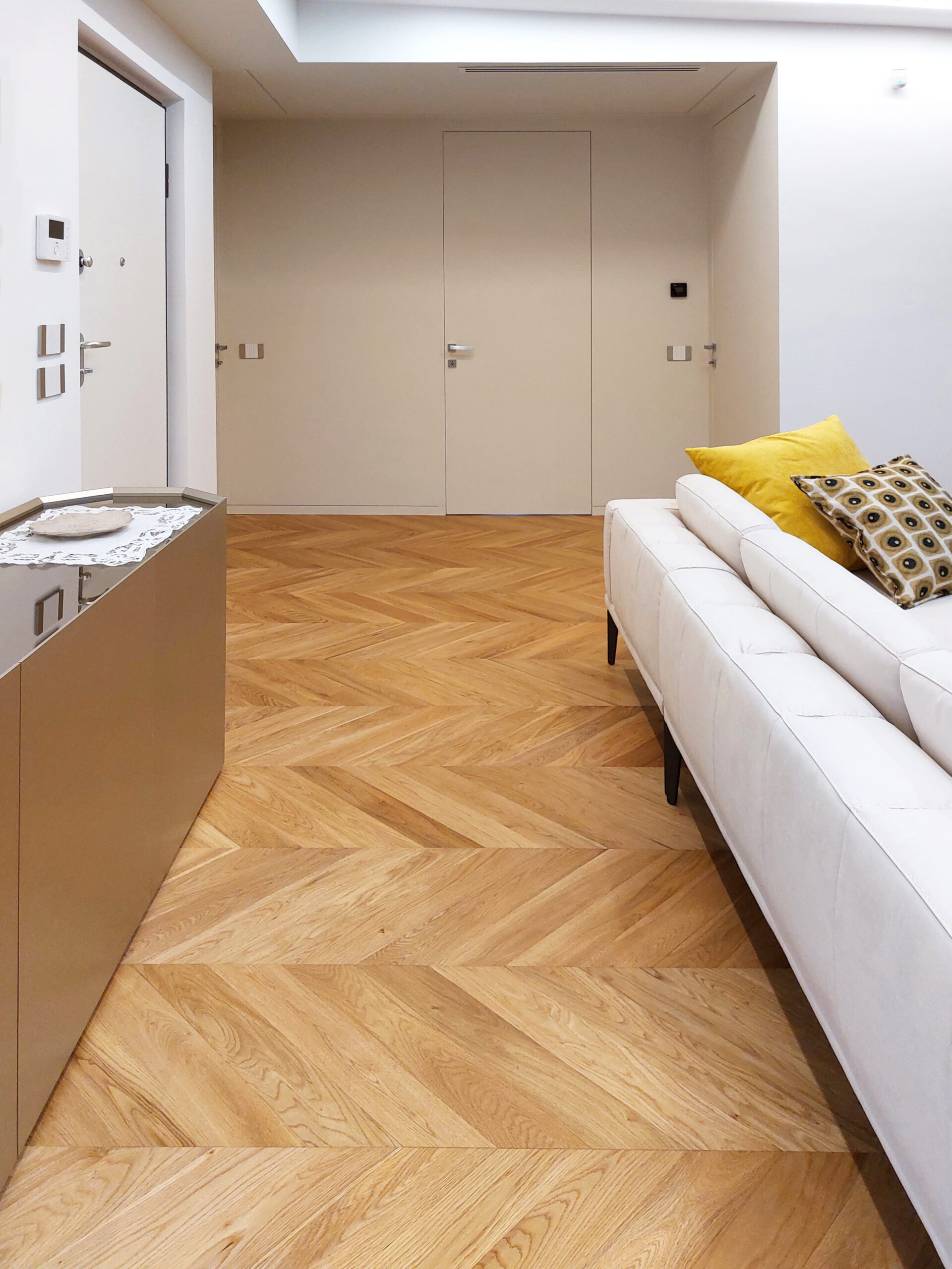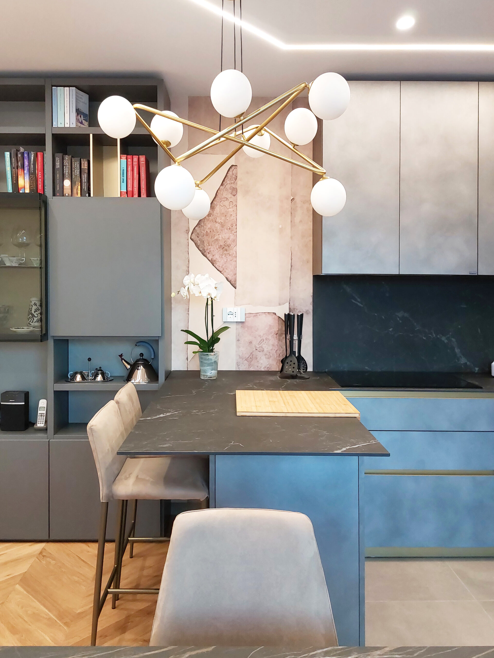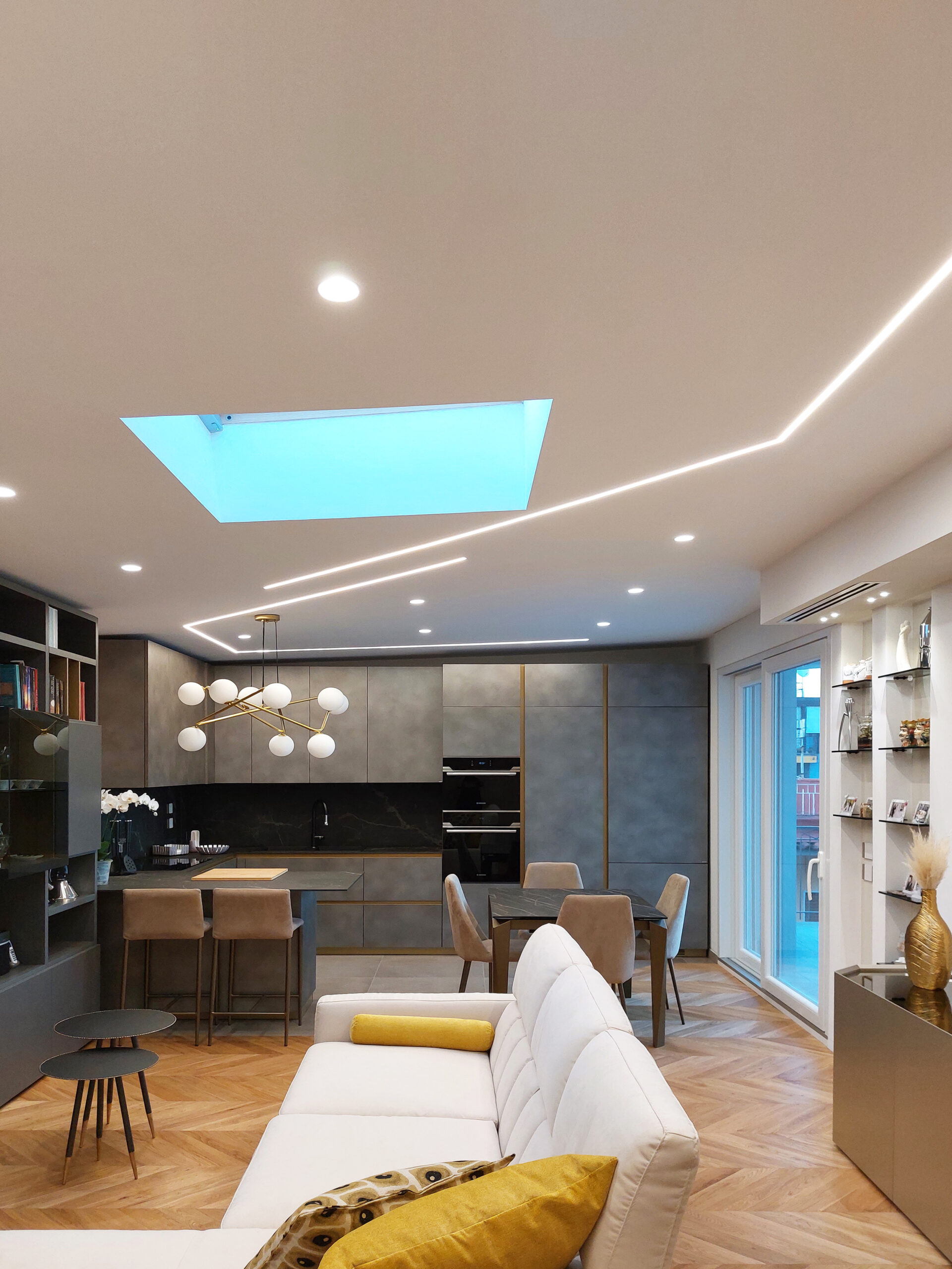 Un appartamento mansardato completamente ristrutturato, dove materiali naturali e arredi su misura definiscono ambienti funzionali e dal forte carattere. La zona giorno open space combina parquet in rovere e gres effetto resina, con elementi in oro ottonato che richiamano stile e raffinatezza. Ogni ambiente, dalla camera padronale con cabina armadio nascosta al bagno con cromie pastello, è pensato per esprimere personalità, armonia e comfort.